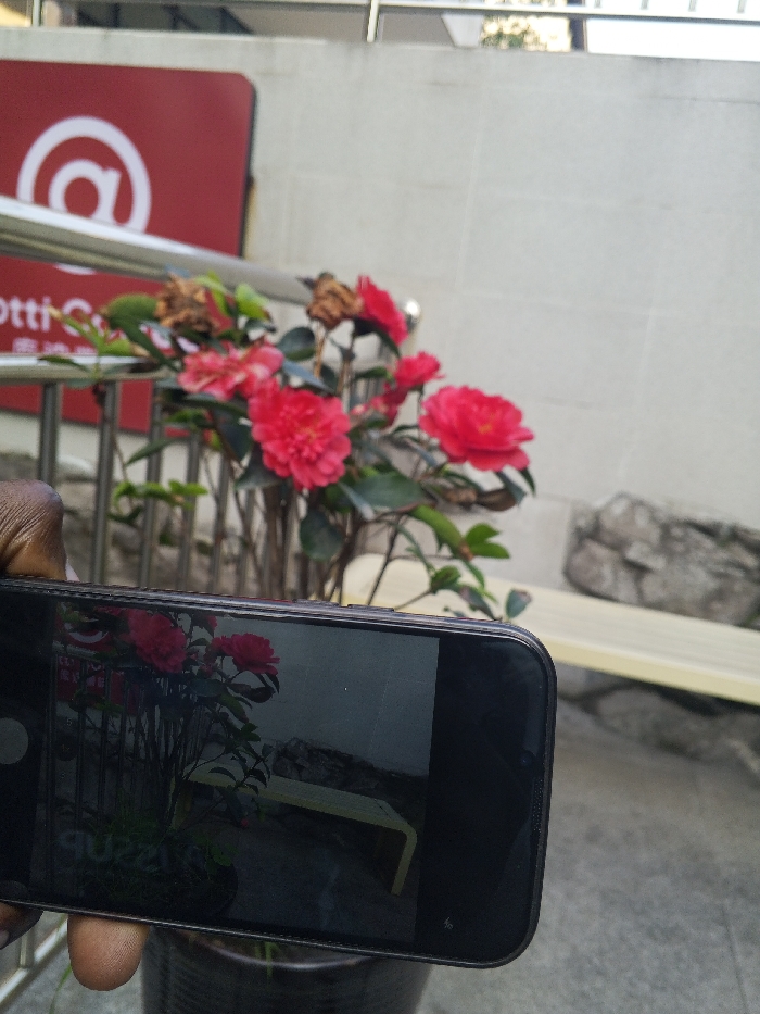 A dark-skinned hand holds a black smartphone horizontally in the foreground, its screen displaying a live camera preview of the scene. The central focus is a potted plant with vibrant red camellia flowers and several brown, wilted blooms, situated behind a silver-colored metal railing. Directly behind the railing, a red sign featuring a white '@' symbol and partial text "ottiC" with Chinese characters, identifying it as a Cotti Coffee establishment, is visible. The background consists of a light gray tiled wall. To the right, a light-colored, minimalist bench is present, with a textured rock structure positioned beyond it. The scene is an outdoor urban setting in Jiangjin, China.