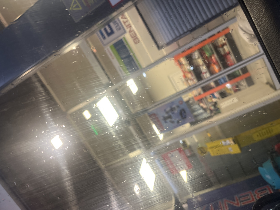 The image captures a commercial establishment in Byala, Bulgaria, viewed from an exterior perspective through a wet, streaked glass surface, likely a vehicle window