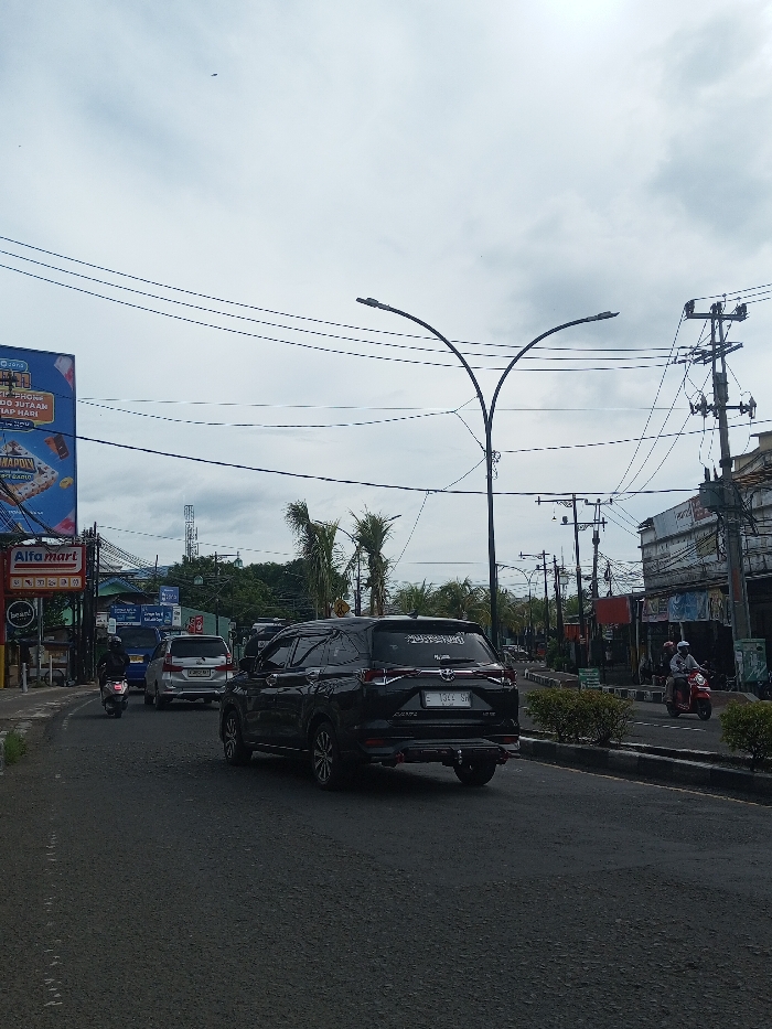 A street scene shows a black SUV with license plate "C 1311 SH" driving on a paved road. Other vehicles include a silver car and motorcycles. A large billboard advertising "Alfamart" is visible on the left. Overhead, power lines crisscross the sky, connected to streetlights and utility poles. Tropical palm trees stand amongst buildings and vegetation. The sky is overcast.