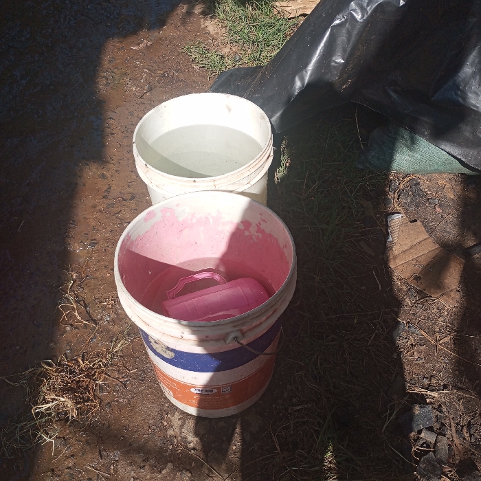 - "Two white buckets sit on the ground near a patch of grass and a black plastic sheet" by FM-iEAFO2, licensed under CC BY 4.0