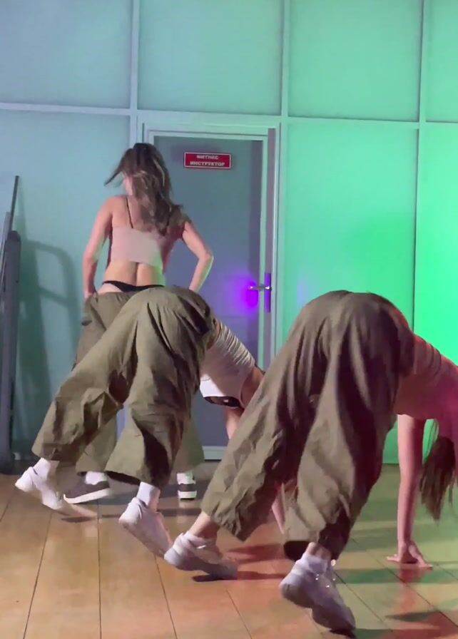 Three women are dancing together indoors. They are wearing crop tops and baggy, olive-green pants. Their hair is long and loose. Two women are bent forward at the waist, supported by their hands, while the third is upright and dancing while facing the camera. The background is a glossy wooden floor and a paneled wall with a door. There is green lighting coming from the right. There is a metal pole in the background on the left.