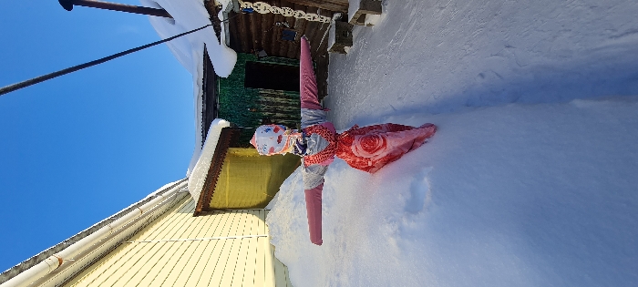 An outdoor scene in Rusalevka, Russia, depicts a snow-covered environment under a clear blue sky. In the foreground, a humanoid figure, resembling an effigy or scarecrow, stands upright in a cleared path of deep white snow. The figure's head is a white fabric sphere with painted red lips, blue eyes, and red cheek dots, topped with a pink and white patterned cap. A dark blue scarf is tied around its neck. It wears a light gray long-sleeved top with pink fabric sleeves extended horizontally. The lower body is draped in a pink fabric or skirt featuring a prominent red rose pattern. To the left, a building with light yellow horizontal siding features a white gutter and a snow-covered roof. A smaller, brown-roofed entrance structure is partially obscured by snow in front of it. To the right and behind the figure, a dark green building with an open doorway is visible. Adjacent to it, a rustic log structure with carved details and a dark metal chimney protruding from its snow-laden roof is present. Two small, square concrete or wooden blocks are visible in the snow near the log structure. An overhead dark cable spans diagonally across the upper portion of the frame. The ground is uniformly covered in undisturbed white snow, save for the cleared path.