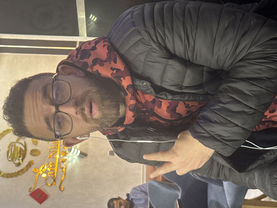 The scene is an interior shot within "Café Nia" in Salé, Morocco, indicated by a prominent gold-colored "Café Nia" sign with a coffee cup emblem and a small Moroccan flag affixed to a light-colored wall. The primary subject is a male with light skin, short dark hair, a beard, and a mustache, wearing black-framed glasses. He is dressed in a red and black camouflage-patterned hoodie layered under a black quilted puffer jacket. A white wired earphone is visible in his left ear, with the cable running down the front of his jacket. His mouth is slightly ajar. His right hand is raised to chest height, forming a V-sign with his index and middle fingers extended. In the left background, another male, partially obscured, is seated at a table, wearing a blue hooded sweatshirt and looking downwards. The cafe features blue upholstered chairs and what appears to be tabletops. The environment is indoors with artificial lighting.