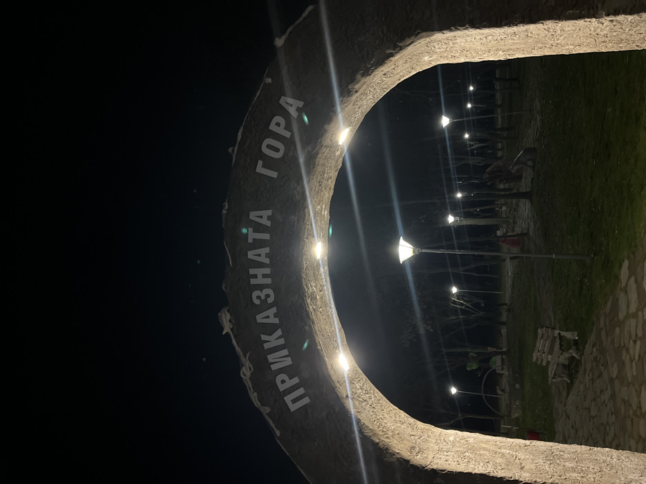 - "The image depicts a nighttime scene at the entrance to a park in the city of Rakovski, Bulgaria, specifically through an arched gateway bearing the Cyrillic inscription "ПРИКАЗНАТА ГОРА" (The Fairy Forest)" by FM-l7bR73, licensed under CC BY 4.0