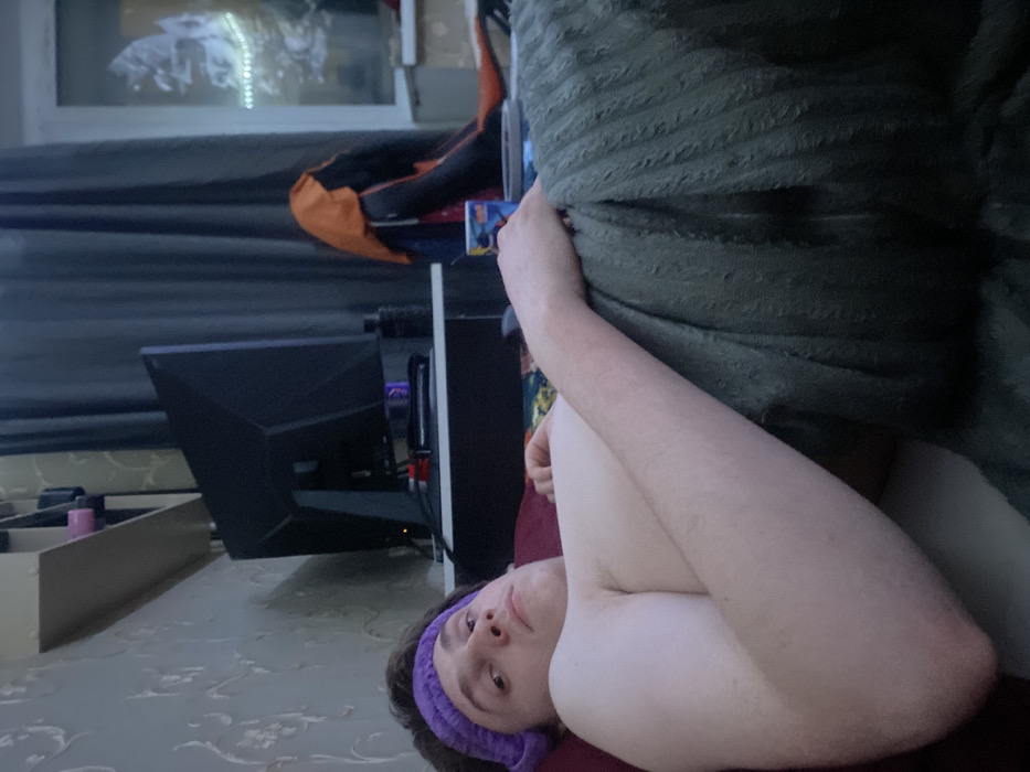 A young male is depicted lying on his back, partially propped up, in an indoor setting within the city of Saratov, Russia. He wears a purple headband and is bare-chested, with a textured dark green blanket covering his lower torso. His gaze is directed towards the viewer. The background features a light-colored wall with a subtle pattern. To the right, a dark computer monitor sits on a white desk. Behind the monitor, dark curtains partially cover a window through which outdoor lights, possibly decorative string lights, and a tree-like outline are visible against a dark exterior, indicating evening or night. A dark office chair with an orange fabric item draped over it is positioned near the window. The room is dimly lit.