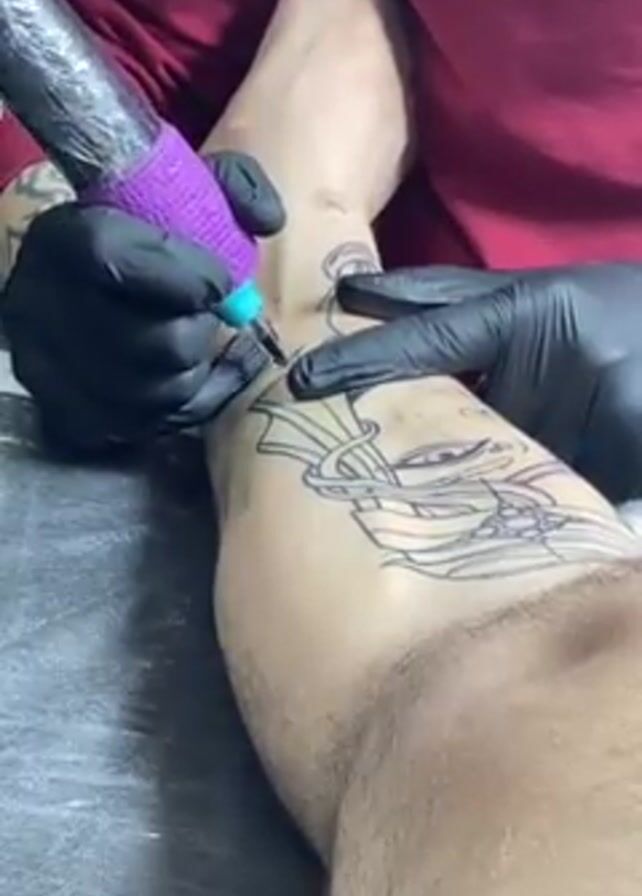 A close-up shows a tattoo artist wearing black gloves in the process of tattooing a design onto a person's calf