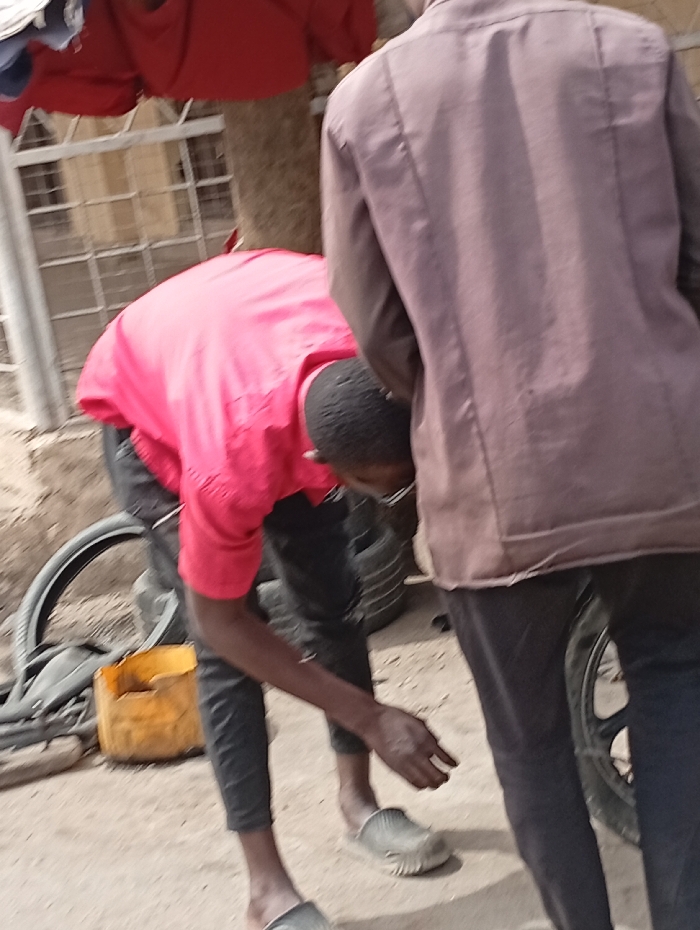 Two individuals are observed outdoors in Gawuna, Nigeria. In the immediate foreground, facing away from the camera, stands an individual wearing a light brown long-sleeved shirt and dark trousers. Partially obscured by this person, a second individual, wearing a bright pink short-sleeved shirt and dark trousers, is bent over at the waist, looking downwards. This individual has a dark complexion; one foot is bare, while the other wears a grey clog-style shoe. Their hands are positioned near their feet, seemingly attending to something on the ground or their footwear. The ground surface is light-colored, possibly dirt or concrete. In the mid-ground and background, multiple bicycle or motorcycle tires are visible. A yellow, partially damaged plastic container rests on the ground near the bending individual. In the upper left background, red fabric is seen hanging, with a metal grid-like structure and a vertical brown support (possibly a tree trunk or pole) also present.