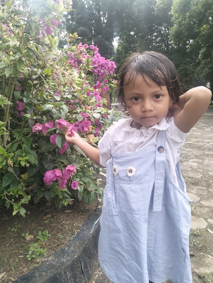 - "A young child with dark hair stands beside a flowering bush with vibrant pink blossoms" by FM-sAcf03, licensed under CC BY 4.0