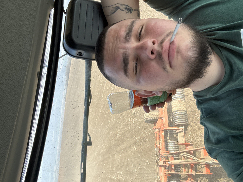A male individual is depicted in a selfie taken from inside the cab of an agricultural vehicle, likely a tractor, operating in a tilled field near Dolna Oryahovitsa, Bulgaria. The man, with short dark hair, a moustache, and a short beard, wears a dark green t-shirt. A lit cigarette is held in his mouth, positioned centrally. His left arm is raised, with his hand resting behind his head, revealing a partial tattoo of a downward-reaching hand on his bicep. In his right hand, he holds an inverted, clear plastic bottle, partially filled with a reddish-brown liquid. The bottle's bottom, now facing upwards, has a green label fragment. The neck of the bottle appears to be removed or broken. Through the vehicle's windshield, which is visible in the upper half of the image and has dust particles, an expansive, light brown tilled field is visible. Directly outside the vehicle, parts of a large orange agricultural implement with multiple disc rollers and two large wheels are discernible, indicating ongoing or paused field operations. The sky in the distance is bright and clear.