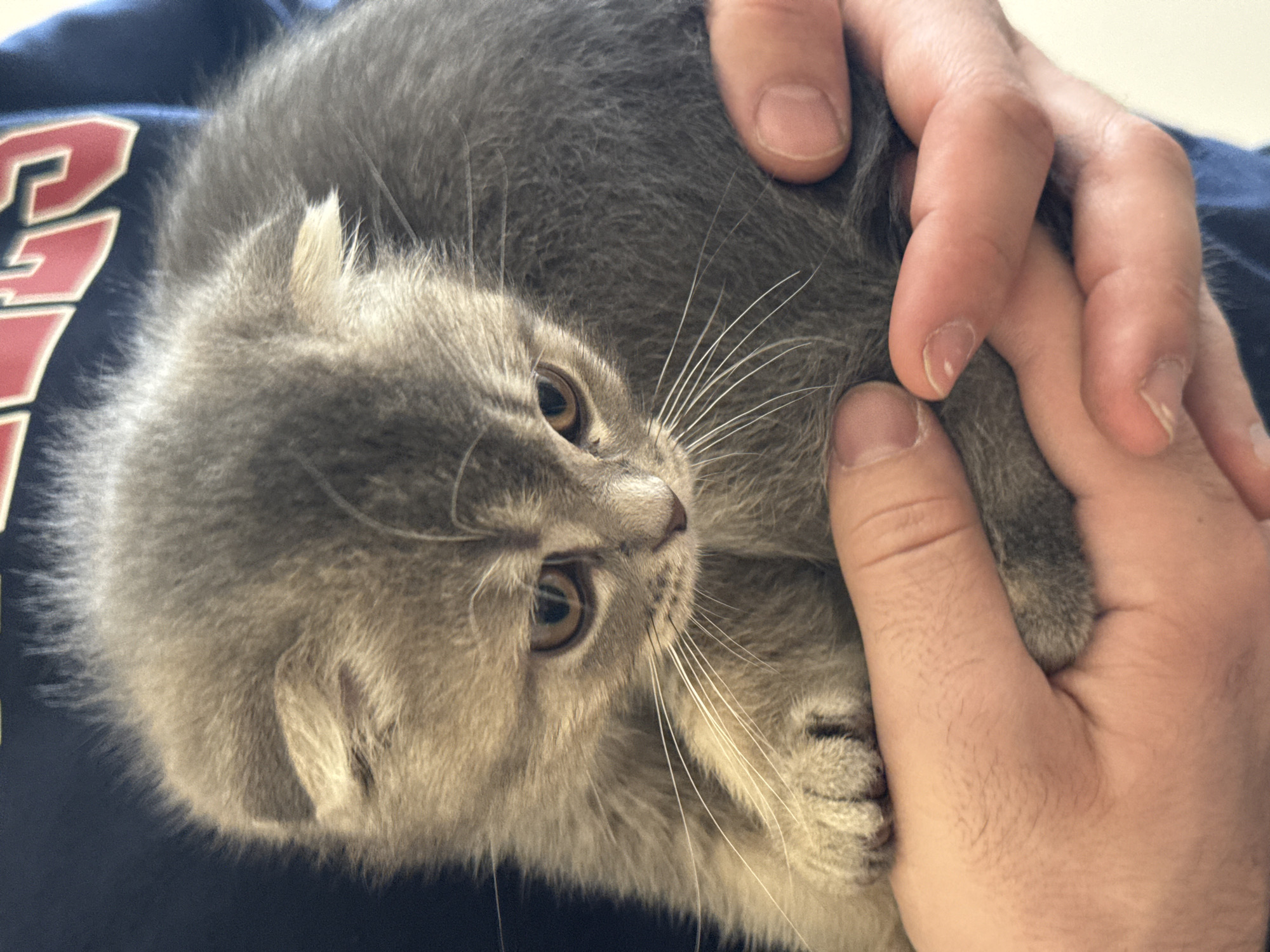 A small, grey-brown domestic kitten with folded ears, dense fur, and amber eyes is captured in close-up, gazing downwards and to its right. Prominent white whiskers are visible. Its front paws rest on the fingers of the left hand. A pair of human hands, exhibiting a light skin tone and trimmed fingernails, gently cradle the kitten. The immediate background behind the kitten consists of a dark blue garment featuring partially visible red and white capital lettering. To the right of the hands, a diffused light-colored background element suggests an indoor environment. The scene is situated indoors, in the city of Strasbourg, France.
