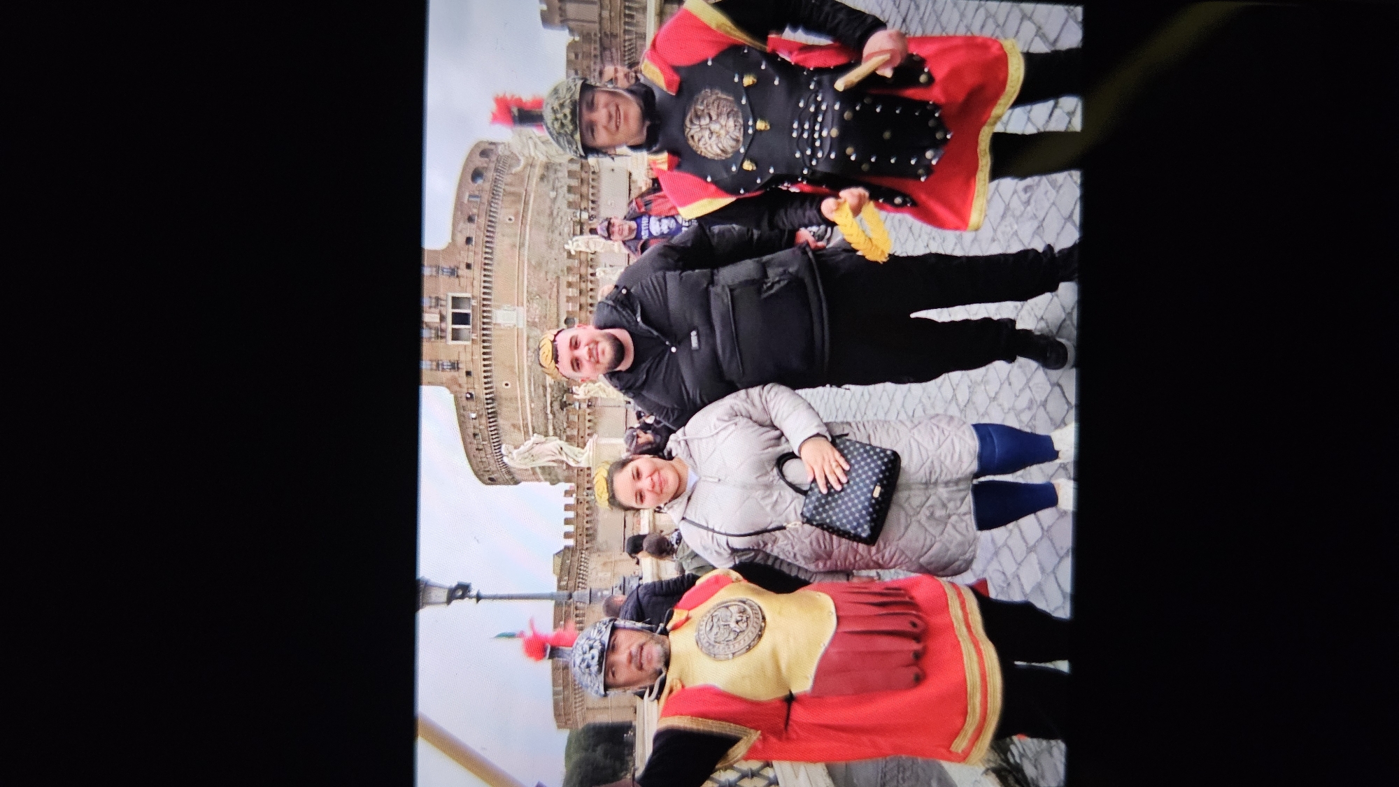 four people, two of whom are dressed in costumes resembling Roman soldiers, posing for a photo in front of Castel Sant'Angelo in Rome, Italy