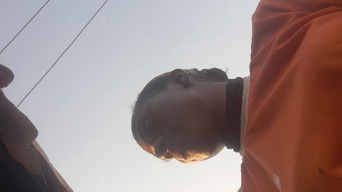 An angled low-angle shot reveals a person in an orange garment against a pale, cloudless sky. The individual's face is partially obscured by the angle and lighting, but facial features and dark hair can be seen. A dark band circles the neck. Power lines are faintly visible in the upper left corner of the frame. The shot is taken outdoors, with the sun potentially behind the camera.