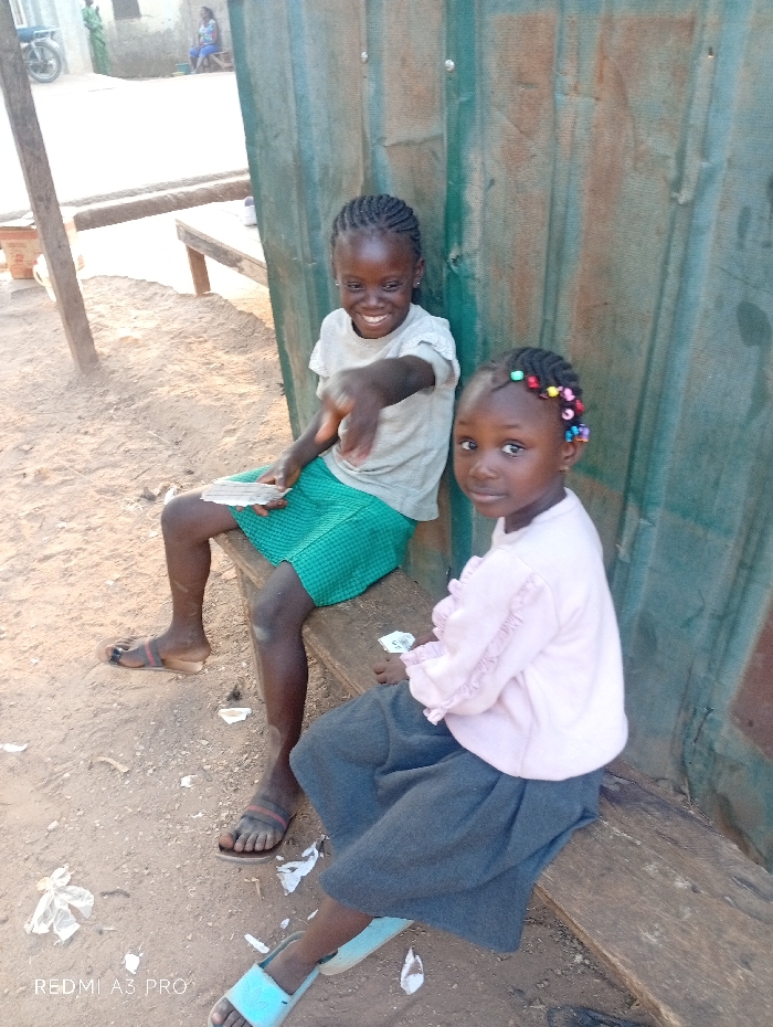 Two young girls sit side-by-side on a wooden bench. One girl wears a light-colored shirt and green skirt, holding what appears to be money, and playfully points towards the camera. The other wears a pink sweater and gray skirt, adorned with colorful beads in her braided hair. They are in an outdoor setting, with a textured metal wall behind them and a dirt ground littered with white debris below. Other figures and a vehicle can be seen in the blurred background.
