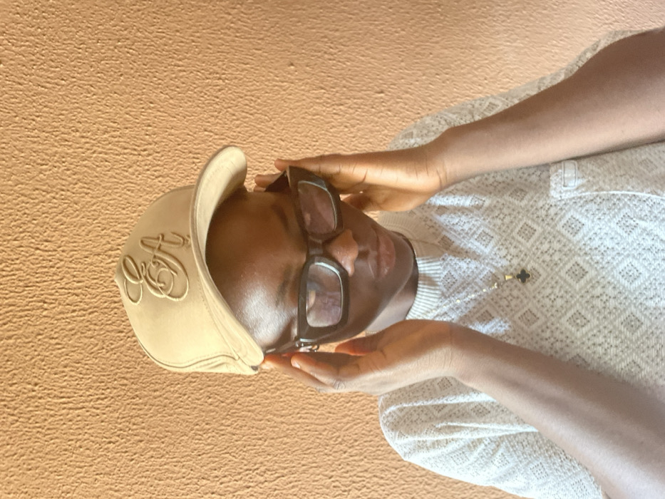 A light-skinned individual is depicted in a head and upper torso shot, positioned against a textured orange-brown wall in Ajara, Nigeria. The individual wears a light brown baseball cap featuring a raised, gold-colored 'EA' script logo on the front, and black, thick-framed rectangular eyeglasses. They are dressed in a light-colored, possibly white, short-sleeved garment with a diamond-patterned weave and a visible chest pocket on the wearer's right. A thin metallic chain with a small black clover-shaped pendant is worn around the neck. Both hands are raised and positioned near the sides of the head, with fingers slightly spread. The individual's gaze is directed downwards and slightly to the viewer's right.