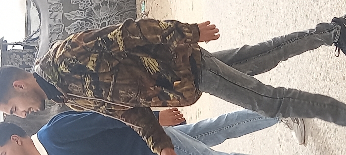 A mid-shot photograph taken in the city of Khan Yunis, Palestinian Territory, depicts two young males walking outdoors on a light-colored paved surface. The primary subject, a male with short dark hair and a light beard, is shown in profile, smiling or speaking. He wears a black turtleneck under a brown, green, and black camouflage hooded jacket with visible drawstrings, dark grey skinny jeans, and black athletic shoes with white soles. His hands are positioned at his sides as he walks. Partially visible behind him and to the left is another young male wearing a blue long-sleeved top with a white collar, light blue jeans, and white athletic shoes with grey accents. The background features a weathered wall or structure adorned with a large, repeating floral pattern in lighter tones against a darker background.