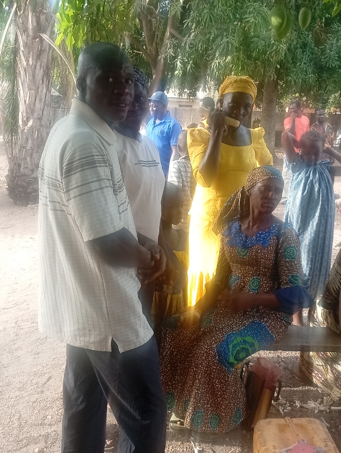 group of people standing and sitting in front of a tree in the town of Gundzhe, Nigeria