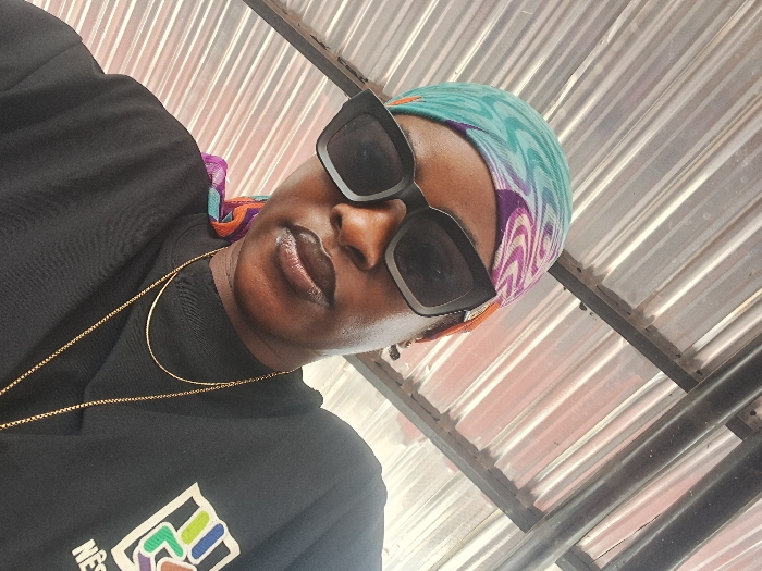A single individual, an adult female with dark skin, is depicted in a medium-close-up, looking directly into the camera. She wears large, dark, square-framed sunglasses and a multi-colored headwrap featuring teal, purple, orange, and white patterns. Her lips are visible and appear glossy. She is dressed in a black long-sleeved garment, adorned with a double-layered gold-colored necklace. On the right side of her chest, a graphic logo is visible, showing a stylized fist composed of colored blocks (green, yellow, purple, blue), with partially visible text "NÈS" beneath it. The background consists of a corrugated metal roof structure, viewed from below, showing light-colored corrugated sheets supported by dark metal beams and trusses. The specific location within Makurdi, Nigeria, cannot be identified from the visual evidence.