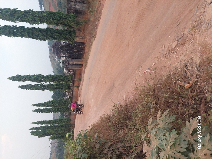 An unpaved, reddish-brown dirt road, sloping gently upwards from left to right, traverses the scene in Umudioka, Nigeria. On the left, dense green and brown foliage, including large-lobed leaves, occupies the immediate foreground and roadside. Two individuals are visible in the middle ground, riding a dark-colored motorcycle away from the viewer. The driver wears a dark garment, while the passenger is dressed in a bright pink top. To the right of the road, a low concrete wall runs parallel to the thoroughfare, featuring an ornate dark metal gate in its central section. Behind this wall, approximately eight tall, slender, dark green columnar trees are spaced along its length. The background reveals undulating hills covered with vegetation and scattered structures beneath an overcast sky. A utility pole is partially visible on the far left. Minor debris is present on the road's shoulder.