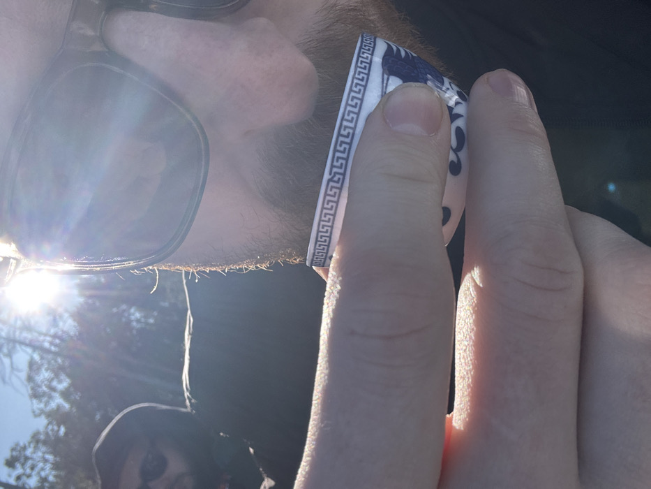The image depicts two males outdoors in Парэцкі сельскі Савет, Belarus, under bright, direct sunlight causing significant lens flare. In the foreground, a male with a beard and mustache, wearing sunglasses, holds a small white ceramic cup with a blue Greek key pattern along the rim and a blue stylized bird design on its side. His right hand positions the cup near his lower face. A light-colored ring with a dark Greek key pattern is visible on his right index finger. In the background, to the left, a second male is partially visible, wearing a dark hooded garment and sunglasses, with his features largely obscured by shadow and backlight. Blurred trees are present in the distant background.