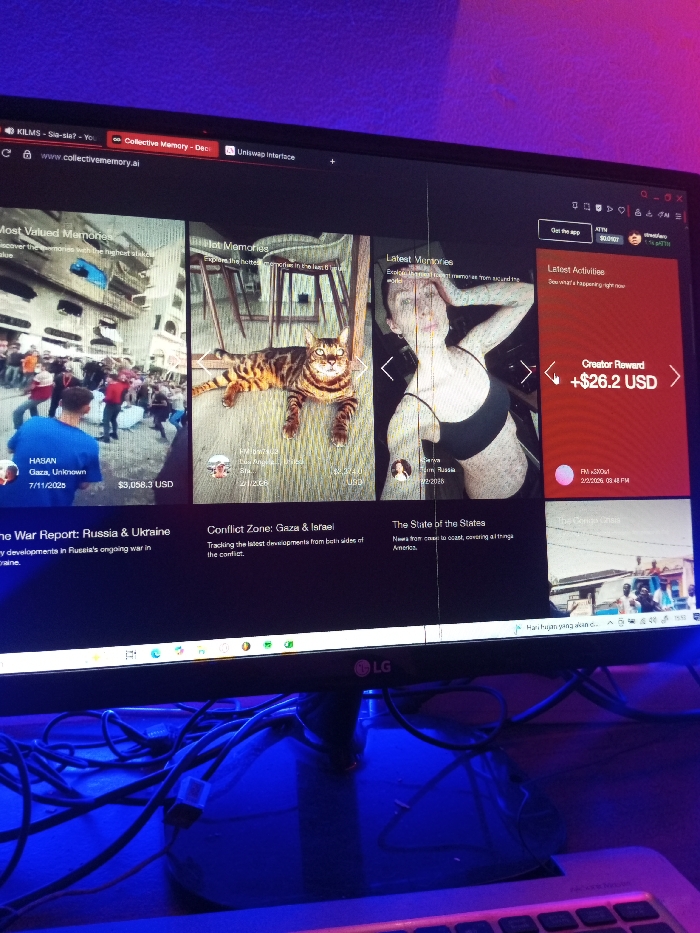 The image displays an LG computer monitor situated on a desk in an indoor environment in Tiruchirappalli, India, illuminated by blue and purple ambient lighting. The monitor screen exhibits several distinct vertical white lines, indicative of potential screen damage or glare. The screen displays the website `collectivememory.ai`, featuring a grid-based interface. The primary content on the monitor includes three visible "memory" sections: 1. **"Most Valued Memories":** Features a wide-angle image of a crowded street scene with numerous individuals, some wearing red attire, potentially a protest or gathering. A person in a blue shirt is visible from the back in the foreground. Text below reads "HASAN Gaza, Unknown 7/11/2025" and "$3,058.3 USD," with the section title "The War Report: Russia & Ukraine." 2. **"Hot Memories":** Presents an image of a tan and black Bengal cat lying on a light-colored wooden floor. Accompanying text indicates "Los Angeles, USA" and "$2,374.0 USD," under the title "Conflict Zone: Gaza & Israel." 3. **"Latest Memories":** Shows a light-skinned woman with extensive tattoos on her arms and torso, wearing a black sports bra, with one arm raised to her head. Text below identifies her as "Senya Perm, Russia 9/2/2026," and the section title is "The State of the States." A red sidebar on the right of the screen displays "Latest Activities" and a "Creator Reward +$26.2 USD," along with a timestamp "2/2/2026, 08:48 PM." The Windows taskbar is visible at the bottom of the monitor, displaying various application icons and a partially visible Indonesian text pop-up. In the physical foreground, a cluster of black cables is visible resting on the desk surface in front of the monitor's stand, and the right portion of a white keyboard is also discernible.