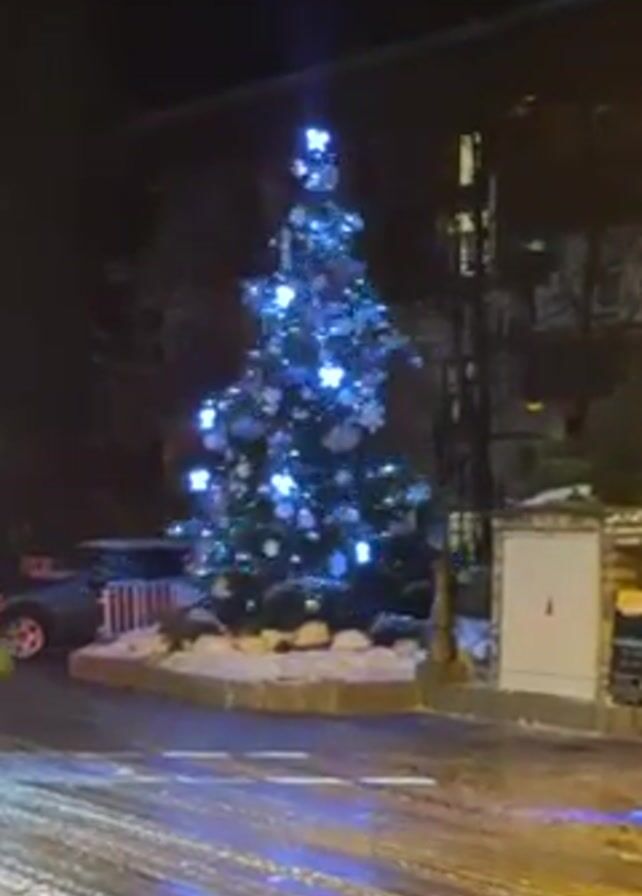 The video depicts a Christmas tree illuminated with blue lights at night. The tree is decorated with snowflake ornaments and has a star on top. It stands on a small patch of ground covered in snow, next to a street covered in snow and slush. Cars can be seen parked nearby, and a street lamp casts a warm glow on the scene. The surrounding buildings are visible in the background, but they are dark and difficult to discern in detail.