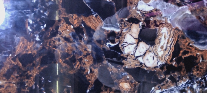 A slab of decorative stone showcases a striking blend of colors and patterns
