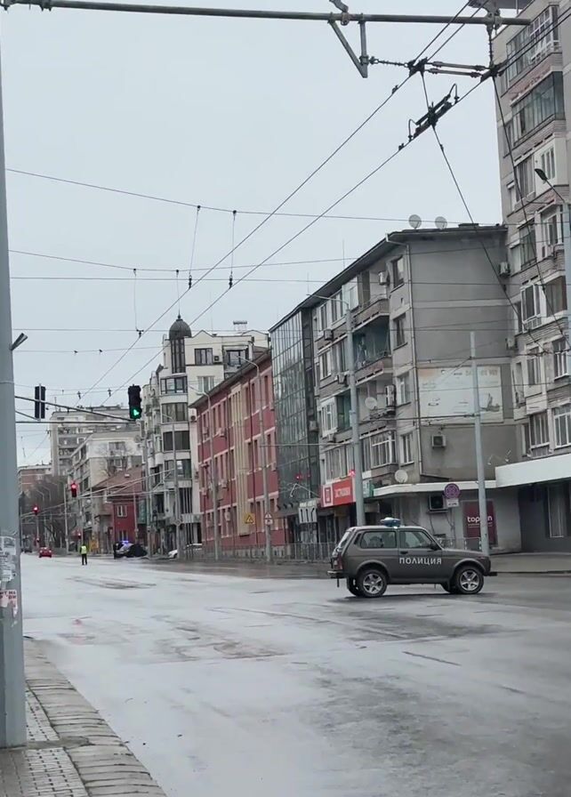 rainy street scene in a city. The street is wet and reflective, and the sky is overcast. Buildings line both sides of the street, and overhead trolley wires are visible. The camera pans slightly as the video progresses. At the start, a gray Lada Niva-type car marked "POLICIJA" (Police) drives across the intersection from left to right. Later, police cars and officers are at the intersection. In the distance, a person in a yellow vest directs traffic. A McDonald's sign is also visible.