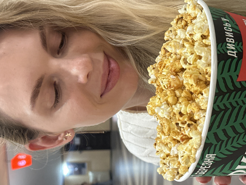 An image taken indoors depicts a woman holding a large bucket of popcorn. The woman, with blonde wavy hair on the right side of the frame, is seen from the chest up, looking downwards with a slight smile. Her eyes are not visible, but her expression suggests contentment or enjoyment. She wears a white, possibly cable-knit, top. Her left ear is visible, adorned with a small stud earring and a gold star-shaped stud from which a slender gold chain dangles. The large bucket of popcorn is held in her hands, positioned below her chin. The popcorn consists of both plain and caramel-coated pieces, filling the bucket to overflowing. The bucket features a dark green design with a pattern resembling pine needles or leaves, and white Ukrainian text is partially visible, including "БЕРЕЗНЯ" (March) on the left and "ДИВИСЬ" (Watch/Look) on the right. The background is blurred, showing an indoor public space with ambient lighting and a red or orange light fixture visible in the upper left corner. The scene is located in Slobozhanske, Ukraine.
