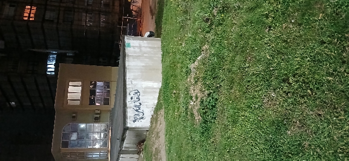 The image depicts an urban nighttime scene in Sliven, Bulgaria. The foreground consists of unkempt green grass, showing areas of thinner vegetation and exposed soil. A rectangular concrete structure with a dark, flat roof is positioned in the midground, featuring illegible black spray paint graffiti on its front face. To the right of this structure, a paved surface is partially visible, alongside a white object, possibly part of a vehicle, under ambient artificial light. In the background, a two-story building with a light-colored facade is illuminated. Its left side displays a large, multi-paned glass facade with an arched top, while the right side presents multiple rectangular windows, some internally lit, and two exterior air conditioning units. Behind this building, a taller, multi-story structure with a darker facade, consistent with an apartment block, has numerous illuminated windows; one upper-floor window emits an orange light. No individuals or specific actions are discernible within the frame.