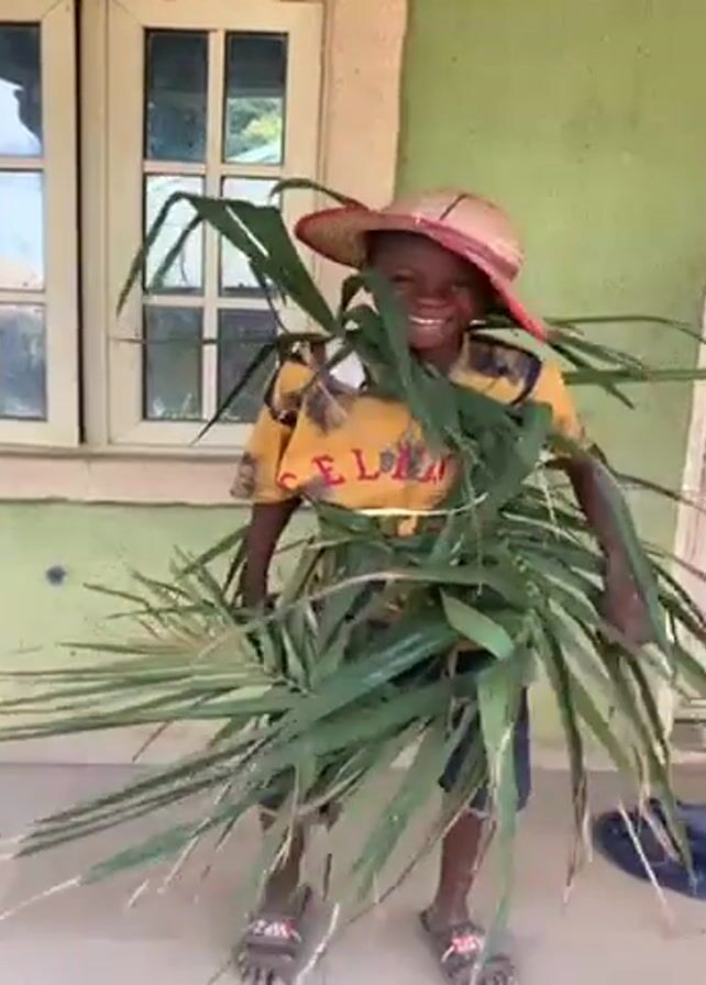 A young child stands on a covered porch next to a window. The child is wearing a yellow t-shirt, dark pants, and a straw hat with a red brim. The child is surrounded by tall green leaves that are tied around their body. The child moves from side to side while holding the leaves. The background includes a light green wall, the window with white trim, and an open door.