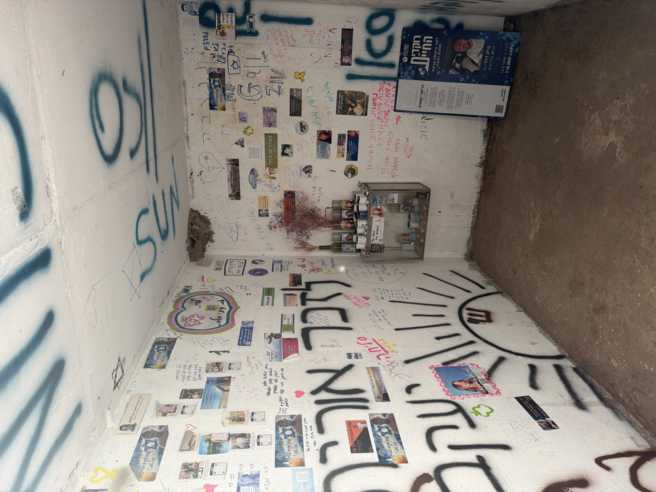 A small, white-walled corner space is filled with graffiti, stickers, and memorial elements. The walls are covered in Hebrew writing, drawings (including a sun), and spray paint. A glass case containing photos and small items sits on one wall, along with bottles. Flyers and brochures lean against the corner. A bird's nest is visible high on the wall. The space appears to be a makeshift memorial or tribute site, adorned with personal messages and images.