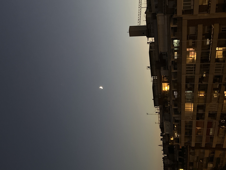 A nighttime aerial or elevated view of an urban landscape in the city of Unknown, Unknown, is presented. The sky transitions from a dark blue at the top, gradually lightening to an orange-yellow hue towards the horizon. A distinct white crescent moon is positioned slightly above the center of the frame. The lower two-thirds of the image display multiple multi-story buildings, consistent with residential or mixed-use structures. Numerous windows on these buildings emit warm yellow interior light, with one window in an upper floor of a central building exhibiting a notably bright, intense orange illumination. Building rooftops feature various utility structures, including antennas, vents, and a prominent rectangular, light-colored tower on the right side. No individuals, specific actions, or interactions are visible within the scene. The environment is distinctly urban.