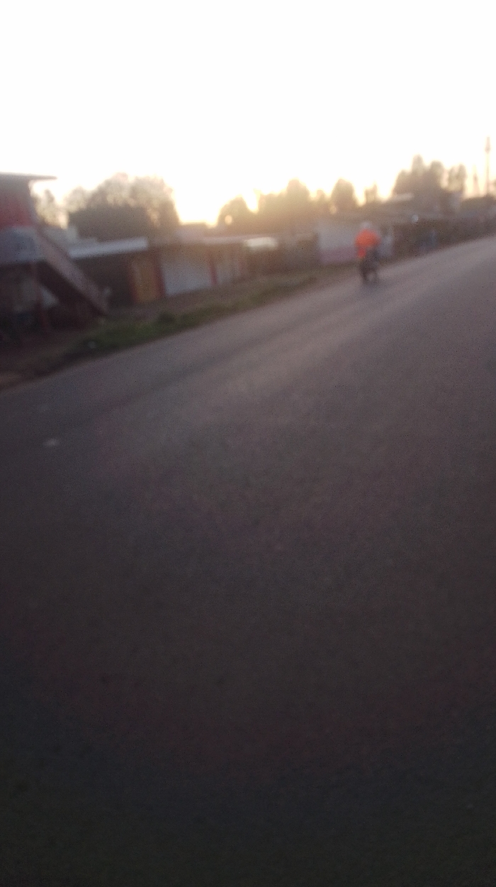 An asphalt road dominates the view, stretching from foreground to horizon under a bright, hazy sky with sun glare. The road's surface transitions from dark in the lower portion to lighter where it meets the horizon. Structures and trees stand blurry and silhouetted to the left of the road. A solitary figure on what appears to be a motorcycle rides into the glare of the sun in the background. The image is largely out of focus, giving it an overall hazy feel.
