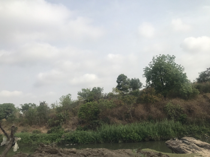 A body of water reflects an overcast sky. A grassy bank lined with verdant vegetation transitions to a dry, sloping hillside populated by trees and shrubs. The vegetation is a mix of green and brown, suggesting a transitional season. Rocks appear near the water's edge, while a small tree or branch is visible on the left. The scene evokes a rural or natural landscape.