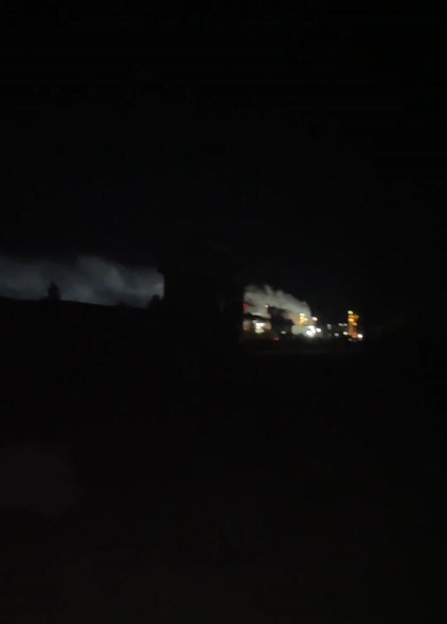 The video is a nighttime shot of an industrial area. There is smoke rising from the facility, illuminated by the facility lights. The shot is shaky, possibly taken from a moving vehicle. The surrounding area appears dark and possibly rural.
