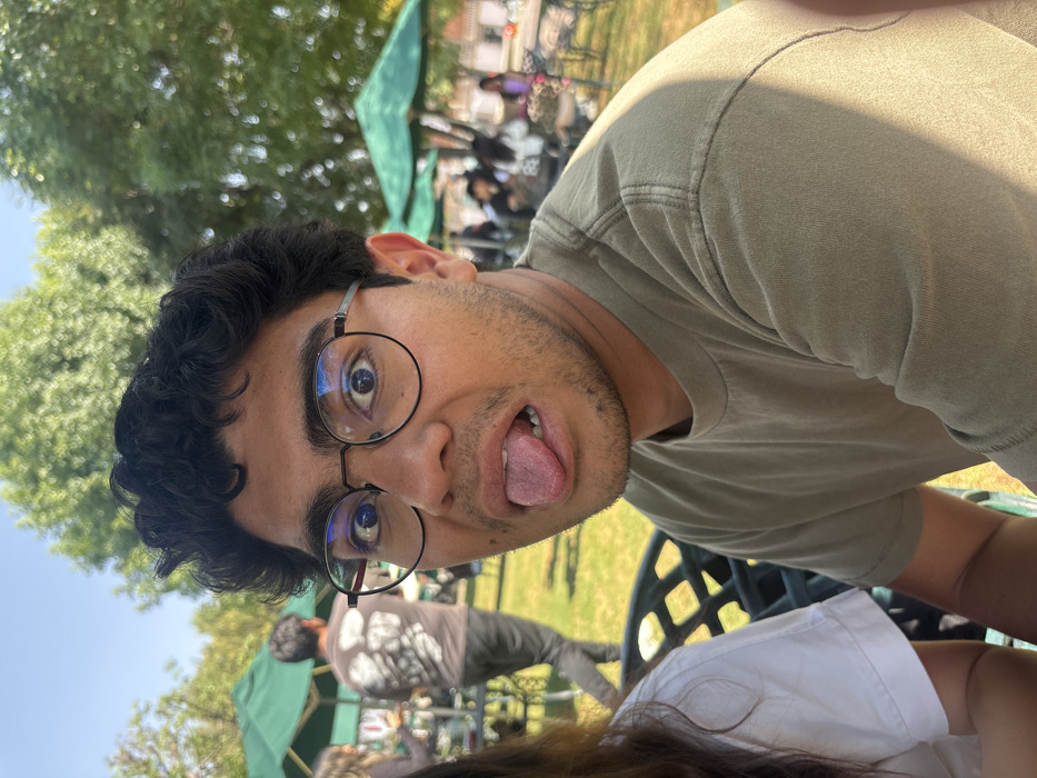 A young man with dark curly hair and round glasses sticks his tongue out towards the camera