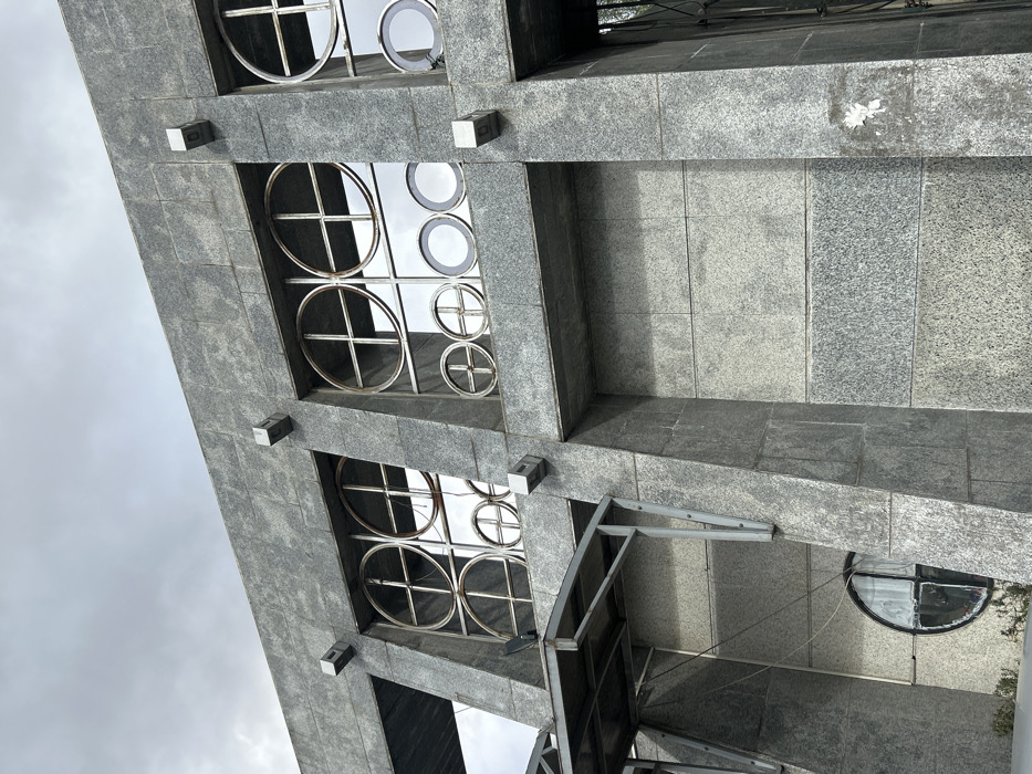 The image displays the exterior facade of a multi-story building located in Al-Qanawat Municipality, Syria, under an overcast sky. The structure is characterized by a modernist architectural design, primarily clad in speckled gray granite tiles. The upper portion of the facade features recessed rectangular window bays, each containing an arrangement of circular windows with metallic frames. Specifically, three such bays are visible: the leftmost and rightmost each house two larger circular windows with internal cross-shaped divisions stacked vertically, and two smaller circular windows below. The central bay features two large circular windows with cross-divisions above four smaller circular windows, two with cross-divisions and two plain. The metallic frames of these windows show visible signs of weathering and minor corrosion. Several small, rectangular, light-colored fixtures are mounted horizontally on the granite between the window bays. On the lower-left, a multi-paneled metal canopy projects outward, supported by angular metal struts. Below this canopy, a single, smaller circular window with a dark interior or reflection is partially visible at a lower level of the building. The granite facade in the lower-right area exhibits a small patch of white residue or discoloration. No individuals or active subjects are present in the scene.