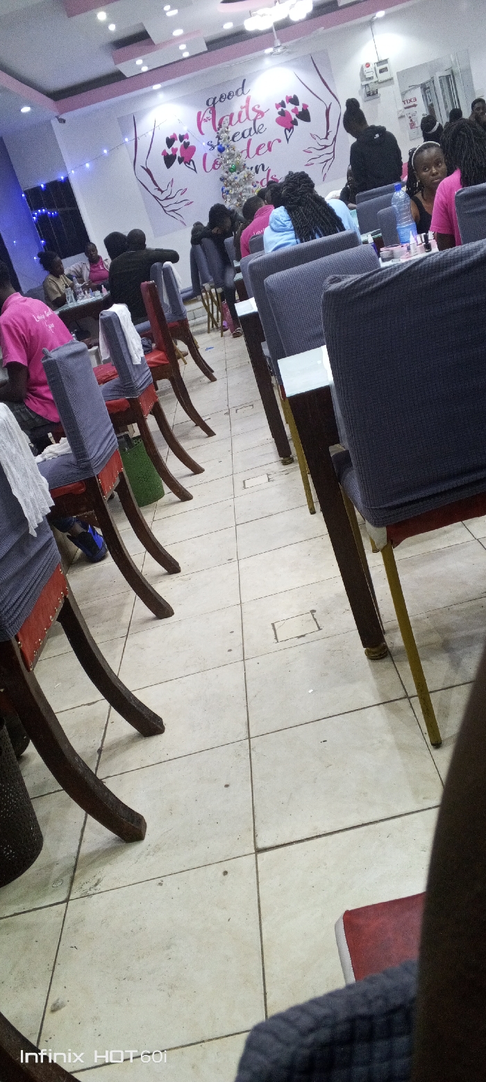 A salon or event space has rows of chairs facing tables where people are gathered. Most chairs are dark grey and have silver accents, while others are red and have brown, curved legs. A wall mural features the phrase "good nails, scale loader," along with an outline of hands and decorative hearts. There are decorative lights, and a small Christmas tree is visible. The flooring is tiled.