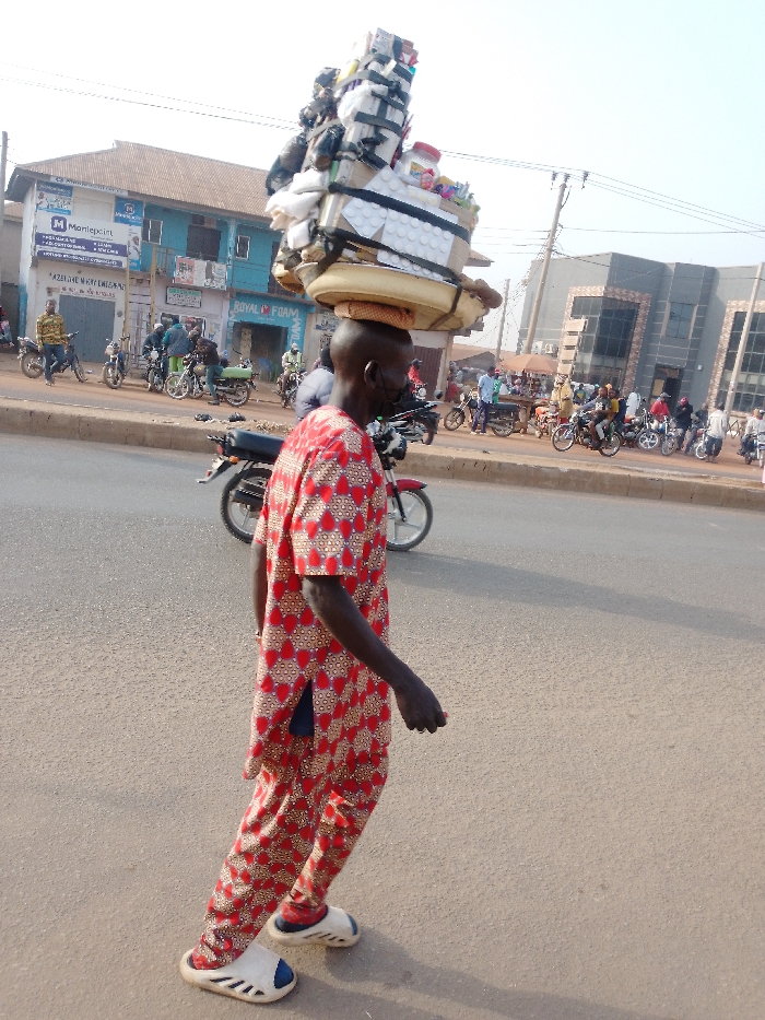 An adult male, viewed from the right side, walks along a paved road in Shaba, Nigeria
