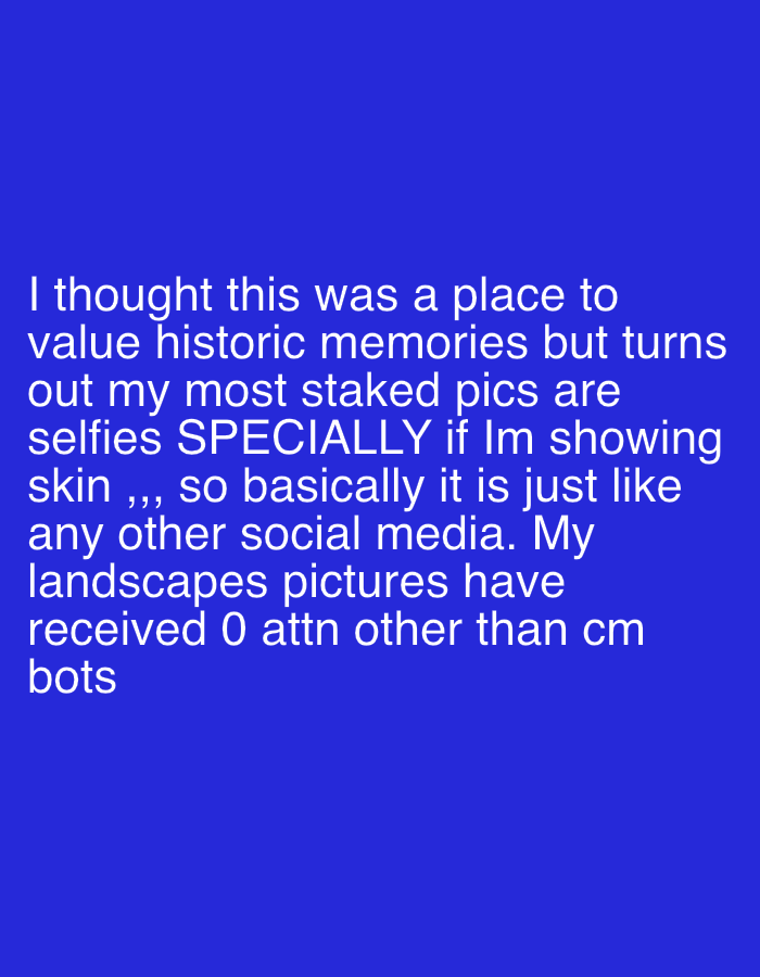 This image is a digital graphic featuring white sans-serif text presented against a solid royal blue background. The text reads: "I thought this was a place to value historic memories but turns out my most staked pics are selfies SPECIALLY if Im showing skin ,,, so basically it is just like any other social media. My landscapes pictures have received 0 attn other than cm bots". No specific physical location within Gijón/Xixón, Spain, or any other geographic area, is depicted in the image. There are no individuals, subjects, or objects other than the text itself and its background. No actions or interactions are visually occurring within the frame. The environment is entirely a uniform royal blue digital field.