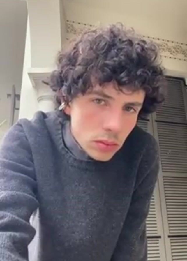 A young man with curly brown hair stands indoors, looking directly at the camera. He is wearing a gray sweater over a dark turtleneck. He has an earring in his left ear. Behind him is an off-white wall with a column and shuttered windows. The camera angle is slightly from below. There is some ambient noise in the background.