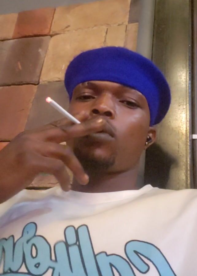 An upward angle shows a man in a blue beret, a white shirt with light blue writing, holding a lit cigarette to his lips