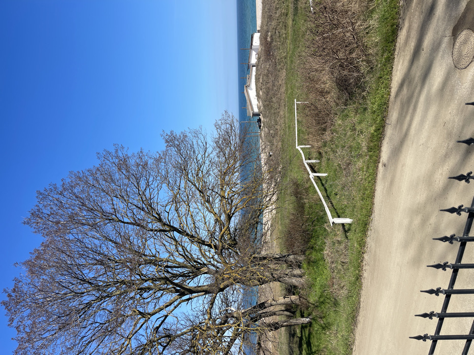 This image depicts a coastal scene in Lozenets, Bulgaria, under a clear, bright blue sky. In the immediate foreground, a black metal fence with pointed finials is partially visible along the bottom edge, behind which runs a light-colored dirt or gravel path. A circular metal manhole cover is embedded in the path on the right side. A large, deciduous tree, mostly bare of leaves and exhibiting a prominent trunk and branches covered in yellowish-green lichen, occupies the left side of the frame. To its right, and extending from the mid-ground, a white wooden railing with multiple posts descends diagonally across a grassy and brush-covered slope. Beyond this slope, a sandy beach is visible, backed by low, vegetated sand dunes. Several small, white-painted structures with light-colored, angled roofs are situated on or immediately behind these dunes. The blue-green waters of the sea extend from the beach to the horizon, meeting the clear blue sky. No individuals or specific actions are present in the scene.