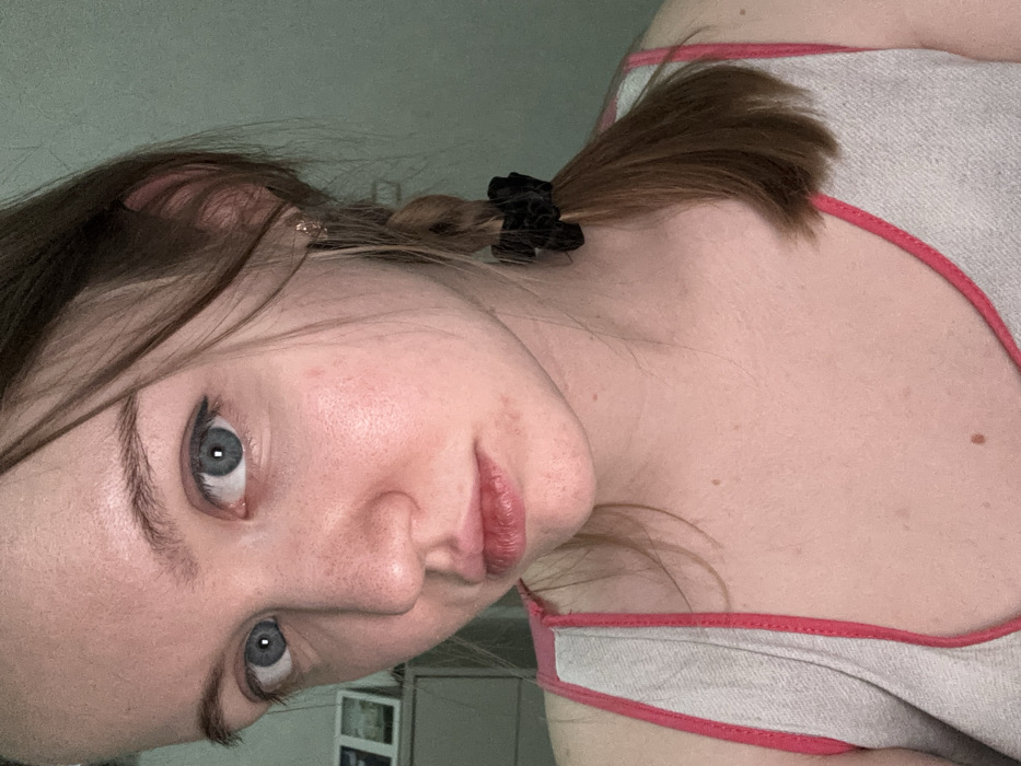 A fair-skinned woman with light blue eyes and brown hair poses for a selfie. Her hair is partially pulled back into a braid secured with a black scrunchie. She wears a light-colored tank top with a thin pink trim. The background is indistinct but appears to be an interior space. Her face is slightly tilted toward the camera, with a subtle hint of a smile.
