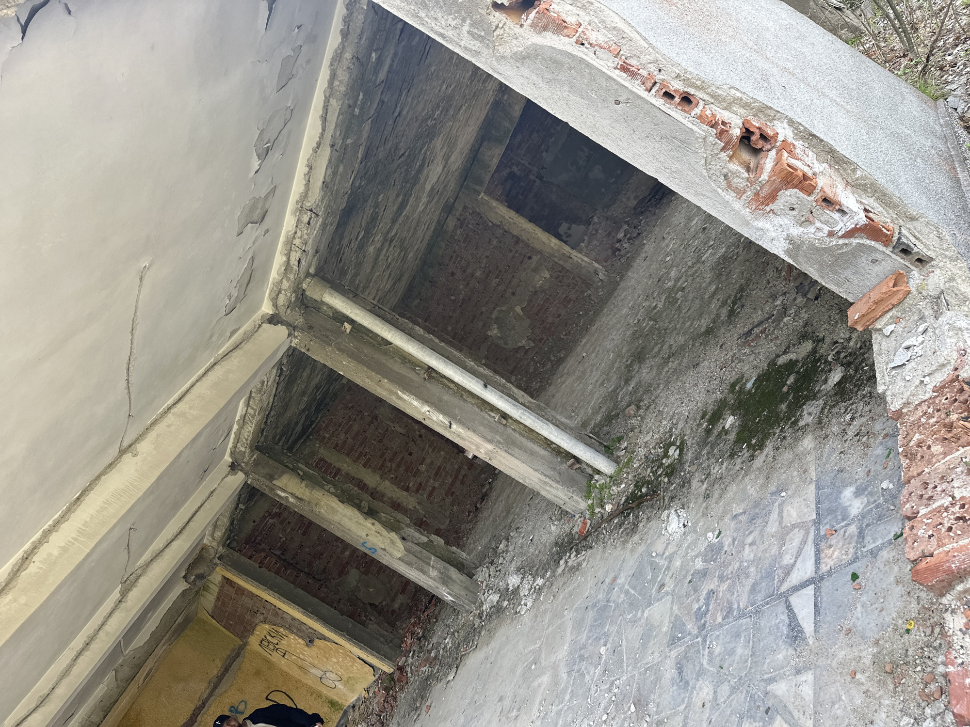 The image depicts an interior space in a state of disrepair