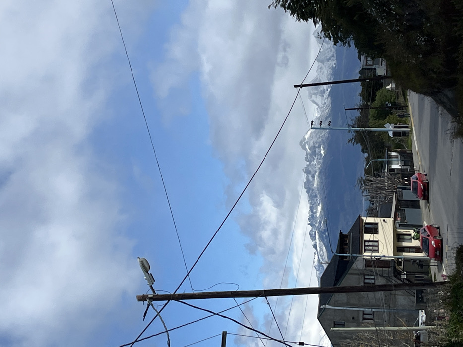 A sideways view of a town street with snowy mountains in the background. A gray sky with white clouds dominates the left side. Power lines crisscross the scene. Utility poles are visible, one with a streetlight. Buildings line the right side of the street with a red car parked alongside. A patch of green foliage is seen at the top right corner.