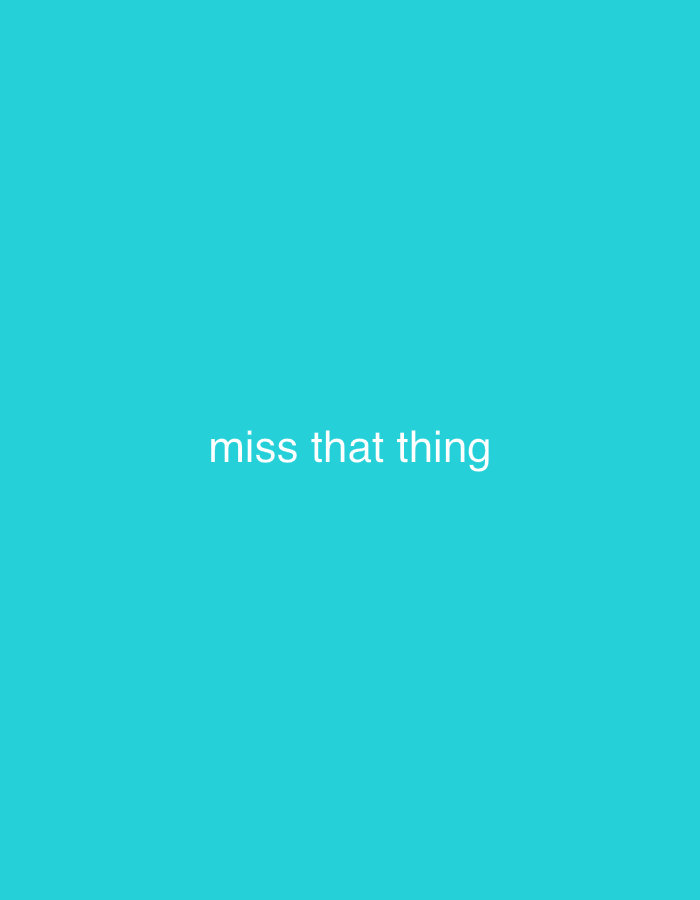 The scene depicts an abstract digital image, notionally situated in the city of Khlong Khut, Thailand. The image features a solid, uniform teal-blue background. Centered horizontally in the lower middle third of the frame, white sans-serif text reads "miss that thing." No discernible people, physical subjects, objects, actions, interactions, or environmental features typical of Khlong Khut, Thailand, are present within the visual content of the image.