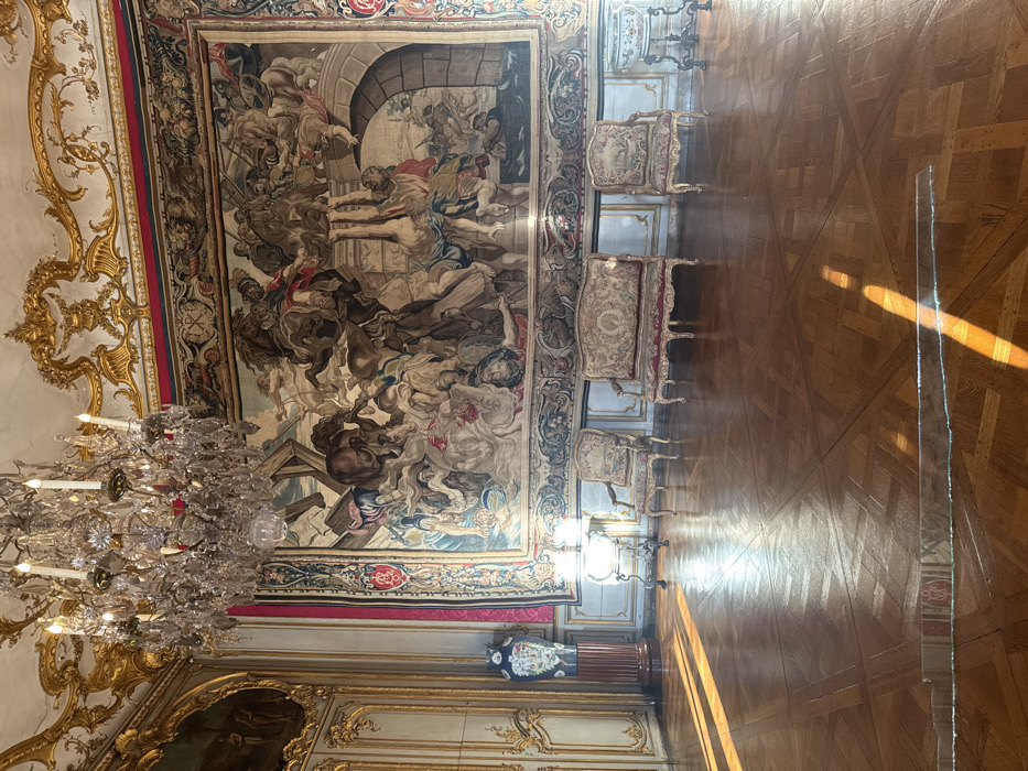 The scene depicts a richly decorated interior room within the Rohan Palace in Strasbourg, France. A high white ceiling is adorned with intricate gold rococo-style moldings. A large, multi-tiered crystal chandelier with illuminated candle-shaped bulbs hangs centrally from the ceiling. The dominant feature of the back wall is a substantial tapestry depicting a dramatic historical or mythological battle. The tapestry features numerous figures, both mounted and on foot, horses, and elements of classical architecture, including an archway visible on the right side. This tapestry is framed by red borders and extends above a light-colored dado rail. Arranged beneath the tapestry along the back wall are three pieces of antique furniture: a central two-seater settee flanked by two armchairs, all characterized by ornate gold-painted wooden frames and light-colored, patterned upholstery. To the left of the left armchair is a small, ornate side table with a light-colored top. To the right of the right armchair, another small, ornate side table supports a decorative ceramic bowl or planter. The left wall, partially visible, features light-colored panels with gold trim. In the corner formed by the left and back walls, a tall, dark-colored vase with white and red decorative motifs rests atop a fluted red pedestal. The floor is made of polished wooden parquet, laid in a geometric pattern. Direct sunlight streams into the room from an unseen source, casting bright, diagonal reflections across the floor. In the immediate foreground, a long, irregularly shaped piece of clear glass or similar transparent material lies horizontally on the parquet, reflecting the incoming light and portions of the room. No individuals are present in the scene.