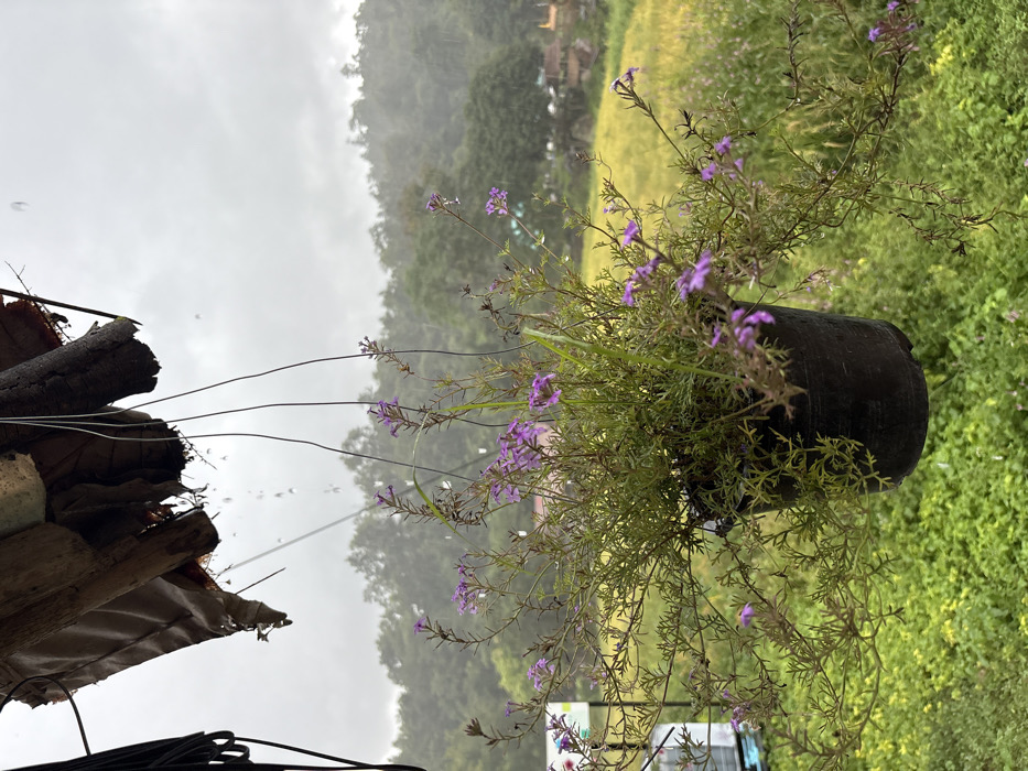 This image, taken in Ban Paem Bok, Thailand, depicts an outdoor scene during rainfall under an overcast sky. In the upper foreground, an overhead structure composed of rough wooden logs and a damaged, possibly tarpaulin sheet is visible, from which multiple raindrops are falling. Black wires or ropes hang vertically on the left. Centrally positioned, a black plastic pot containing a plant with slender green stems and numerous small purple flowers is suspended by thin wires. Evidence of rain, including water droplets, is visible on the plant's leaves and within the frame. The background features a panoramic landscape: distant hills or mountains are densely covered with green trees, partially obscured by rain and atmospheric haze. Below these hills, a broad area of bright yellow-green vegetation, consistent with a cultivated field, spans the mid-distance. Further forward, below the hanging plant, the ground is covered with lush green foliage. Faint structures, including what appears to be a building with a red roof and a blurry sign with blue and white elements, are discernible in the far distance. No individuals are present in the scene.