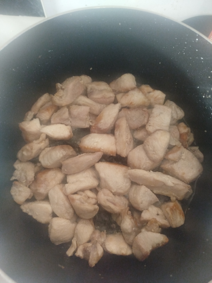 - "The image displays a close-up, top-down view of numerous pieces of diced, light-colored meat, likely chicken or pork, cooking in a dark-colored, possibly non-stick, pot with a speckled interior" by FM-jg5Lp1, licensed under CC BY 4.0